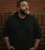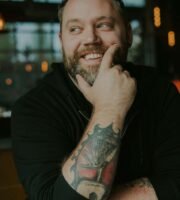 A rustic wooden building houses a laundromat with signs for wash, dry, and fold services. The signage prominently features red and blue text. Red cloth pieces are attached to antennas on the roof. The contrast between the blue sky, white clouds, and green foliage creates a quaint atmosphere.